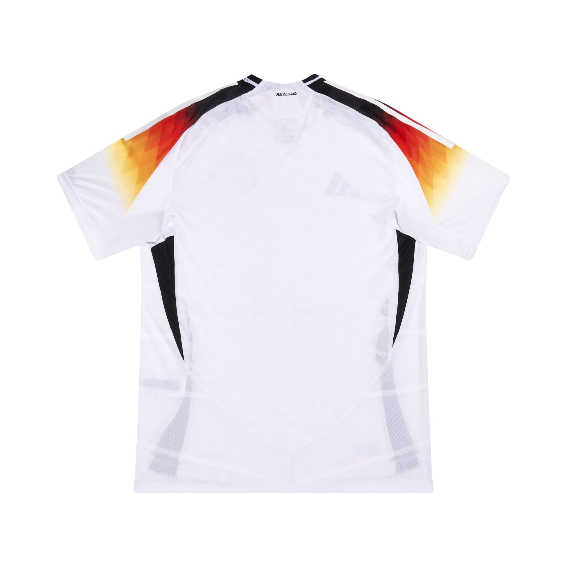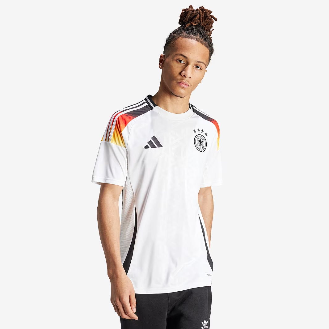 Le maillot domicile de l’Allemagne 2024-2025 est principalement blanc, fidèle à la tradition de la Mannschaft, avec des touches noires et des détails aux couleurs du drapeau allemand (noir, rouge et or).