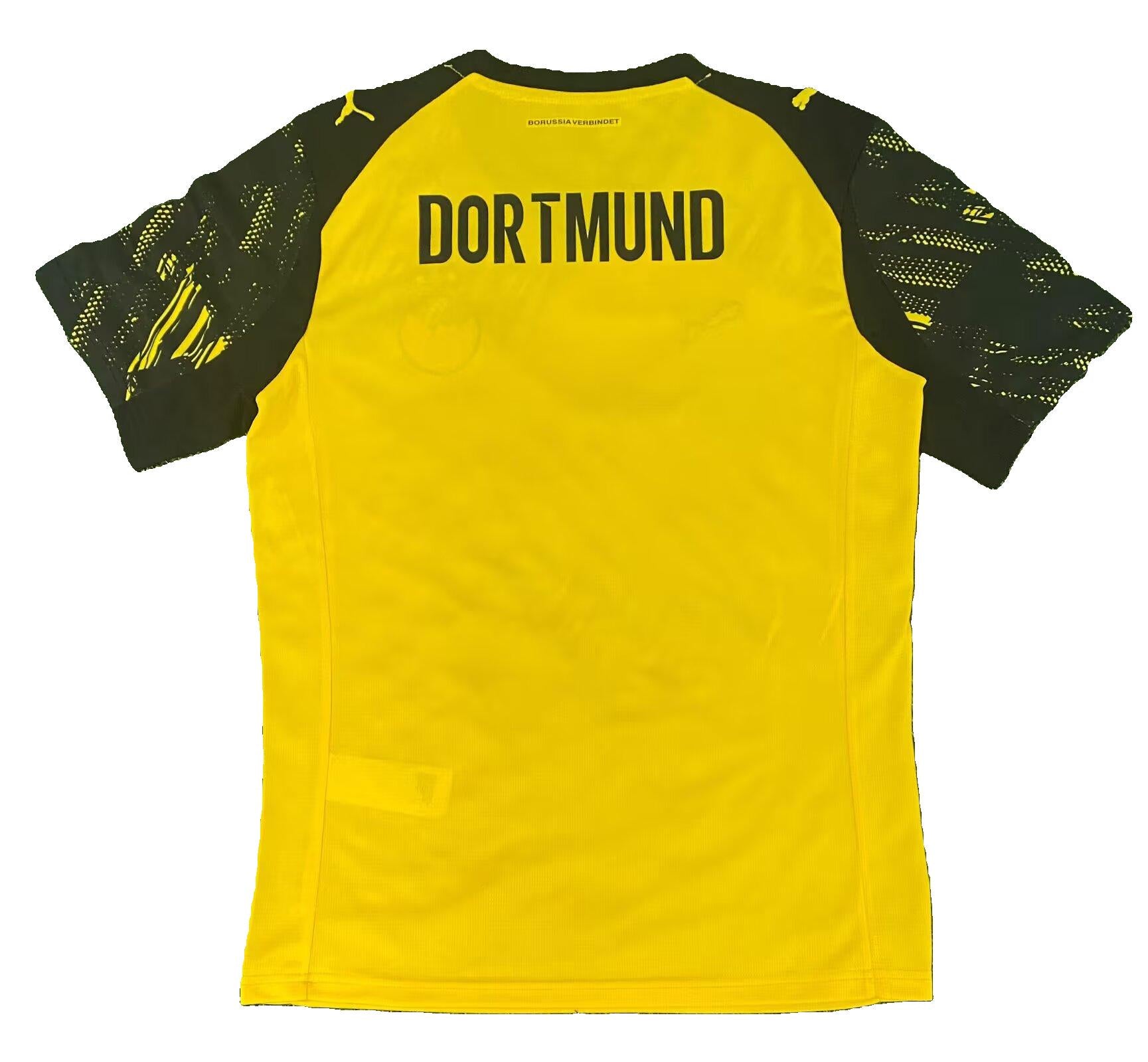 Sur la poitrine, on retrouve le blason du Borussia Dortmund avec ses deux étoiles noires, symbole des titres nationaux, ainsi que le logo Puma. L’inscription « Dortmund » en lettres noires figure au dos, affirmant l’appartenance au club.