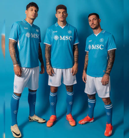 Le maillot domicile du Napoli pour la saison 2024-2025, conçu par EA7 (Giorgio Armani), met à l’honneur le bleu ciel traditionnel du club, accompagné de détails blancs et rouges pour une touche d’élégance moderne.