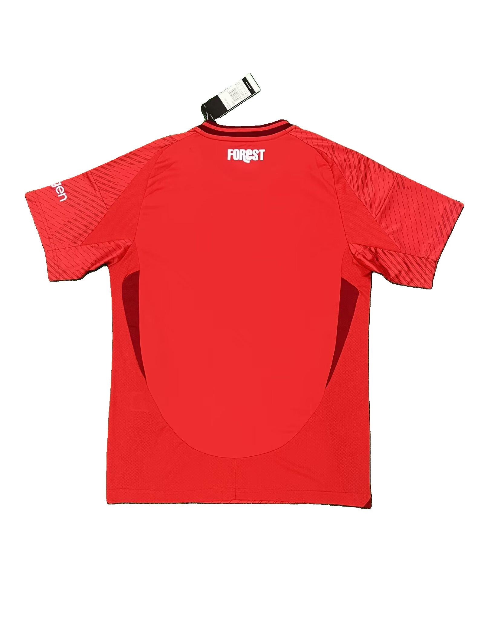 Il est principalement rouge, couleur emblématique de Nottingham Forest, avec un motif subtil de fines rayures sur le devant et les manches, ajoutant de la texture et de la modernité au look classique.