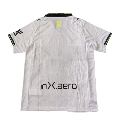 Le col revisité apporte une touche rétro sophistiquée : noir profond, il est subtilement bordé de jaune, alors que les poignets affichent des finitions jaunes et bleues rappelant les couleurs historiques du club.