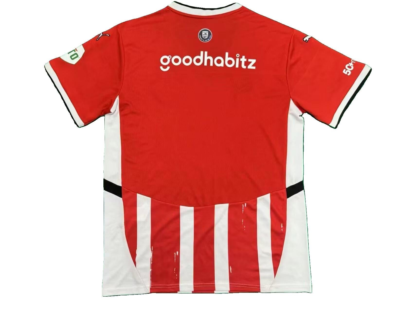 Le maillot domicile du PSV Eindhoven pour la saison 2024-2025, conçu par Puma, conserve les couleurs traditionnelles rouge et blanc emblématiques du club, avec un design unique de rayures à effet pinceau qui symbolisent la fierté, la créativité et l’individualité du PSV.