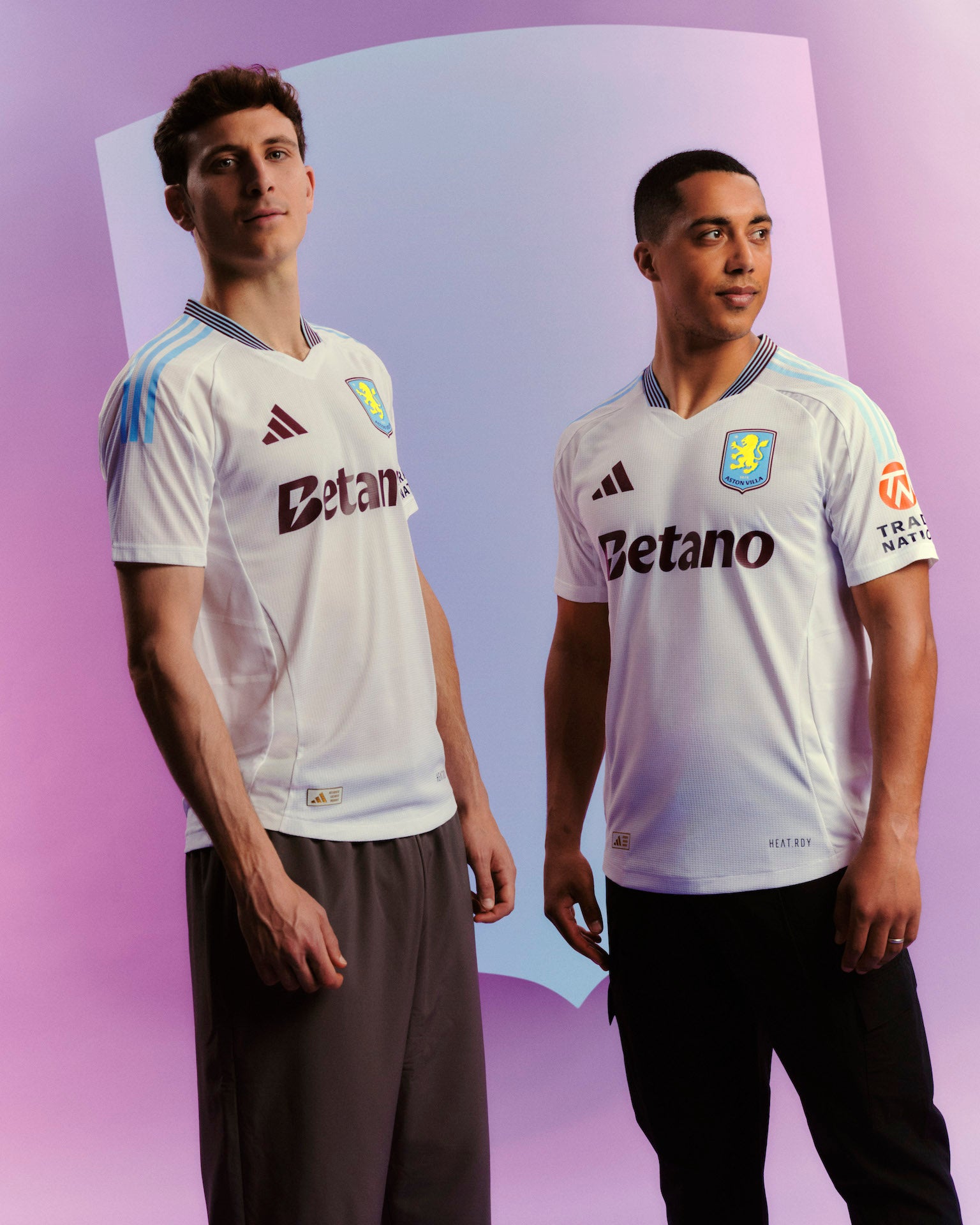 Les logos adidas et du club sont dans une teinte bordeaux, couleur traditionnelle d’Aston Villa, qui contraste harmonieusement avec le blanc dominant.
