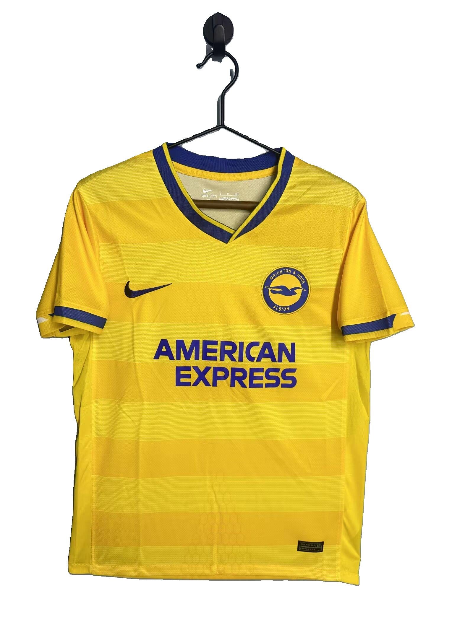 - Le maillot extérieur de Brighton pour la saison 2024-2025 est principalement jaune, une couleur vive qui rappelle le célèbre "university gold" porté lors de la saison 2013-2014.