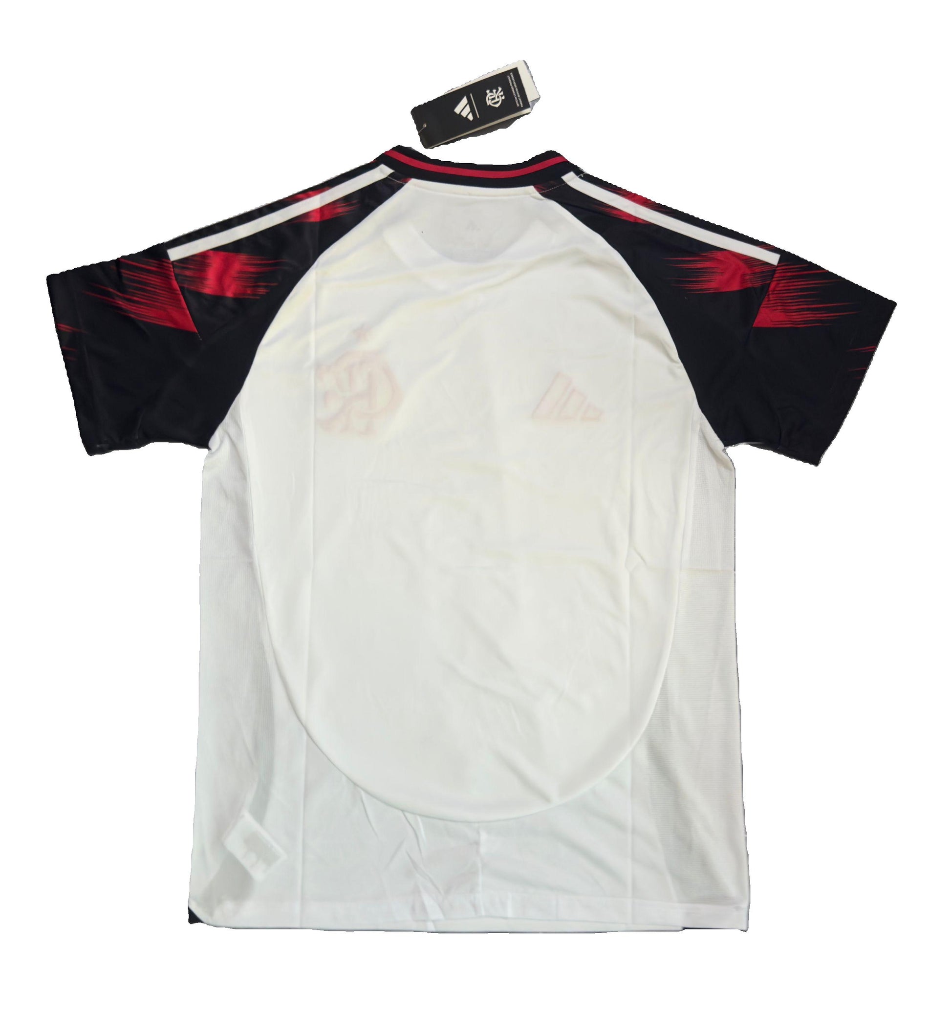 Le maillot extérieur du CR Flamengo pour la saison 2025-2026, conçu par Adidas, présente une base blanche épurée, rehaussée par des manches aux détails graphiques rouges et noirs.
