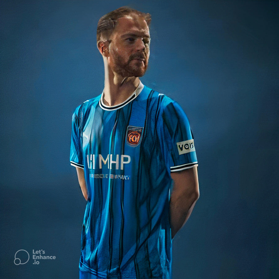 Ce maillot se distingue par sa couleur bleu profond, élégante et moderne, qui offre un contraste saisissant avec les détails blanc présents sur le col, les poignets et les logos. Ce choix de couleurs reflète parfaitement l’identité dynamique et ambitieuse du club.