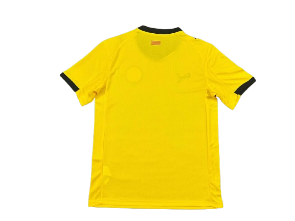 Le col et les bordures des manches noirs soulignent l’élégance du design, tandis que l’écusson rouge du club ressort parfaitement sur le fond jaune, apportant une touche d’originalité et de fierté catalane.