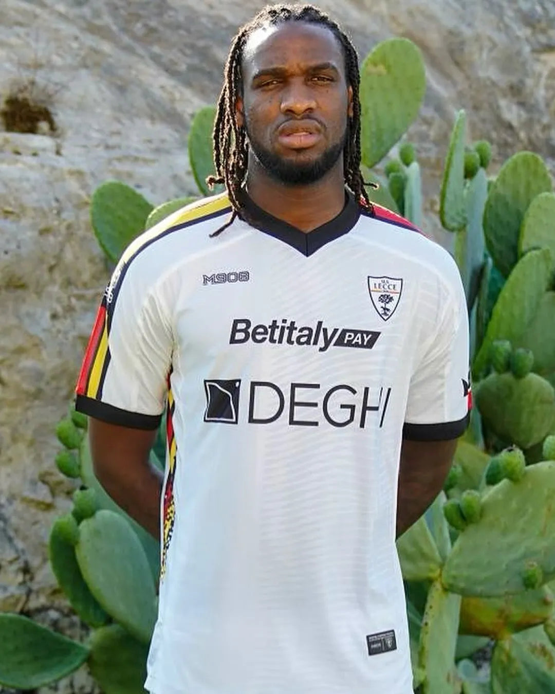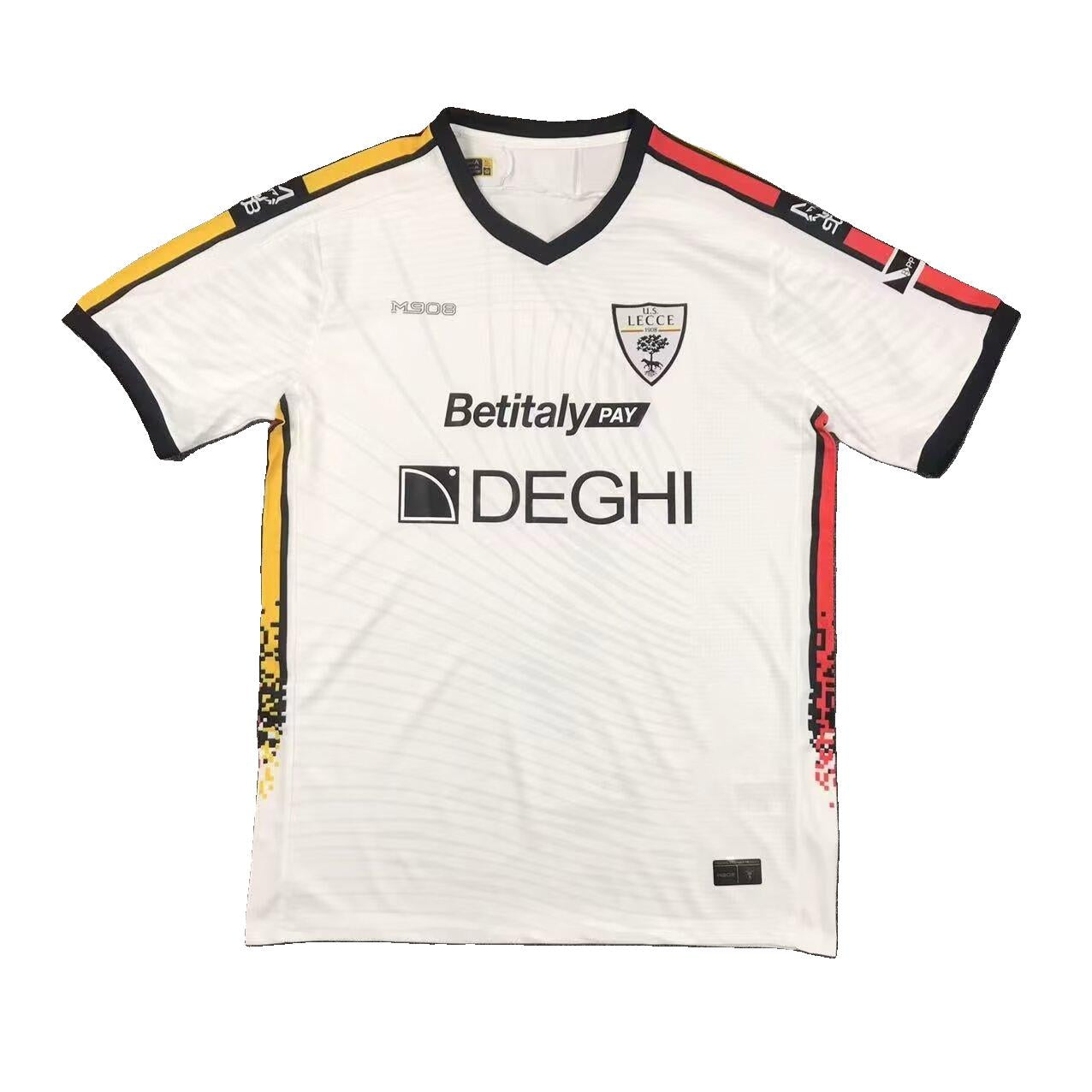 Le maillot extérieur de Lecce pour la saison 2024-2025 est principalement blanc, fidèle à la tradition du club pour ses tenues de déplacement. Il est agrémenté de touches de rouge et de jaune, notamment au niveau des détails et des finitions, rappelant les couleurs historiques de Lecce.