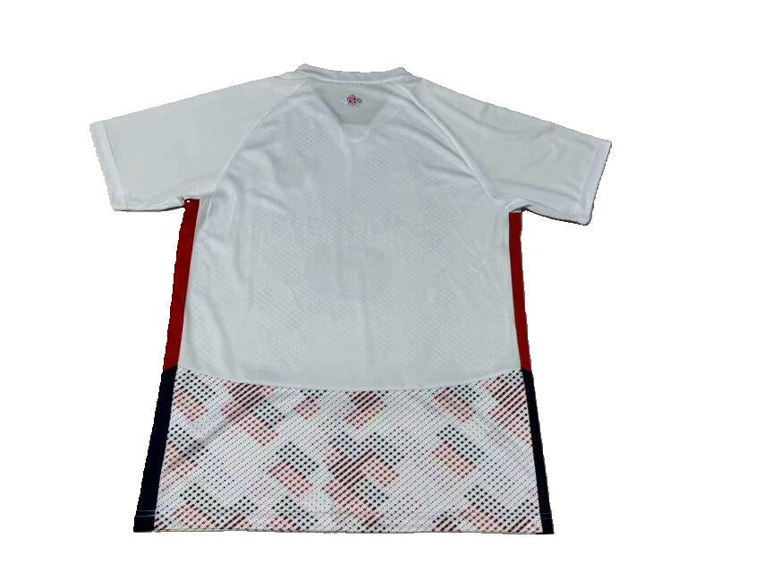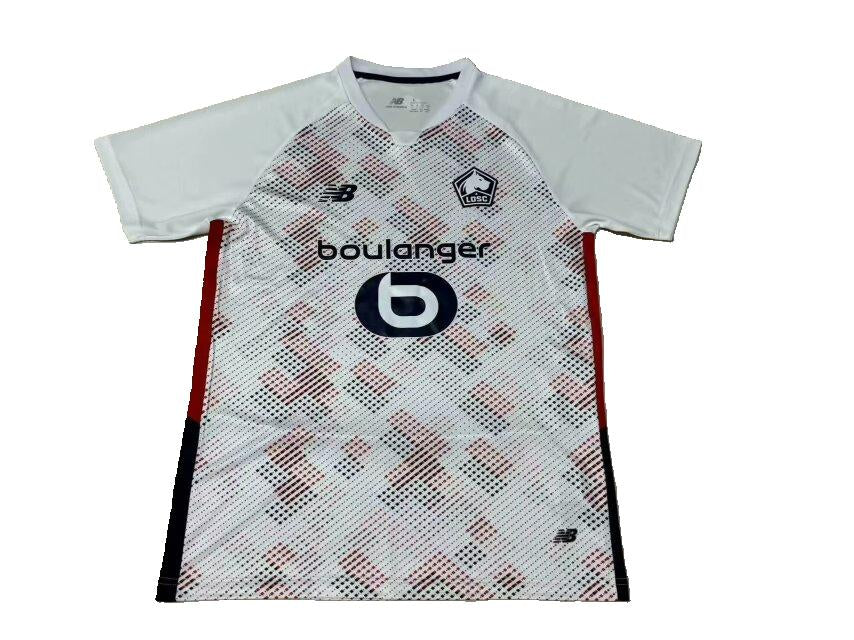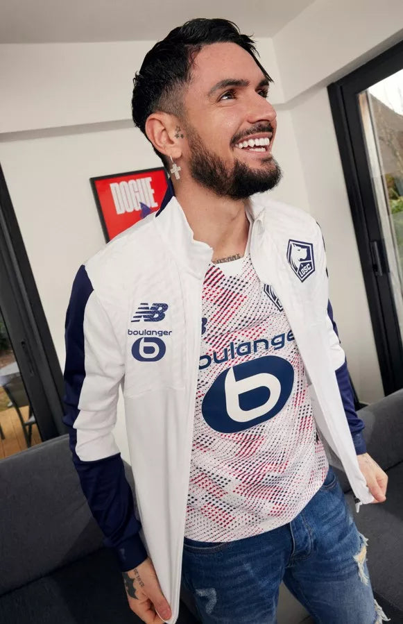 Le maillot extérieur du LOSC Lille pour la saison 2024-2025, conçu par New Balance, célèbre l’héritage textile de la région lilloise à travers un motif Jacquard revisité. Cette tunique à dominante blanche se distingue par des motifs bicolores bleu et rouge, inspirés de la technique du Dotwork, qui ornent subtilement le tissu et rappellent l’importance du textile dans l’histoire du Nord.