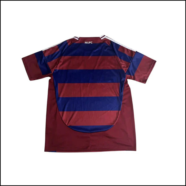 - Le maillot extérieur Newcastle United 2024-2025, conçu par adidas, se distingue par de larges cerceaux (bandes horizontales) bordeaux et bleu marine, un clin d’œil au maillot extérieur iconique de la saison 1995-1996.