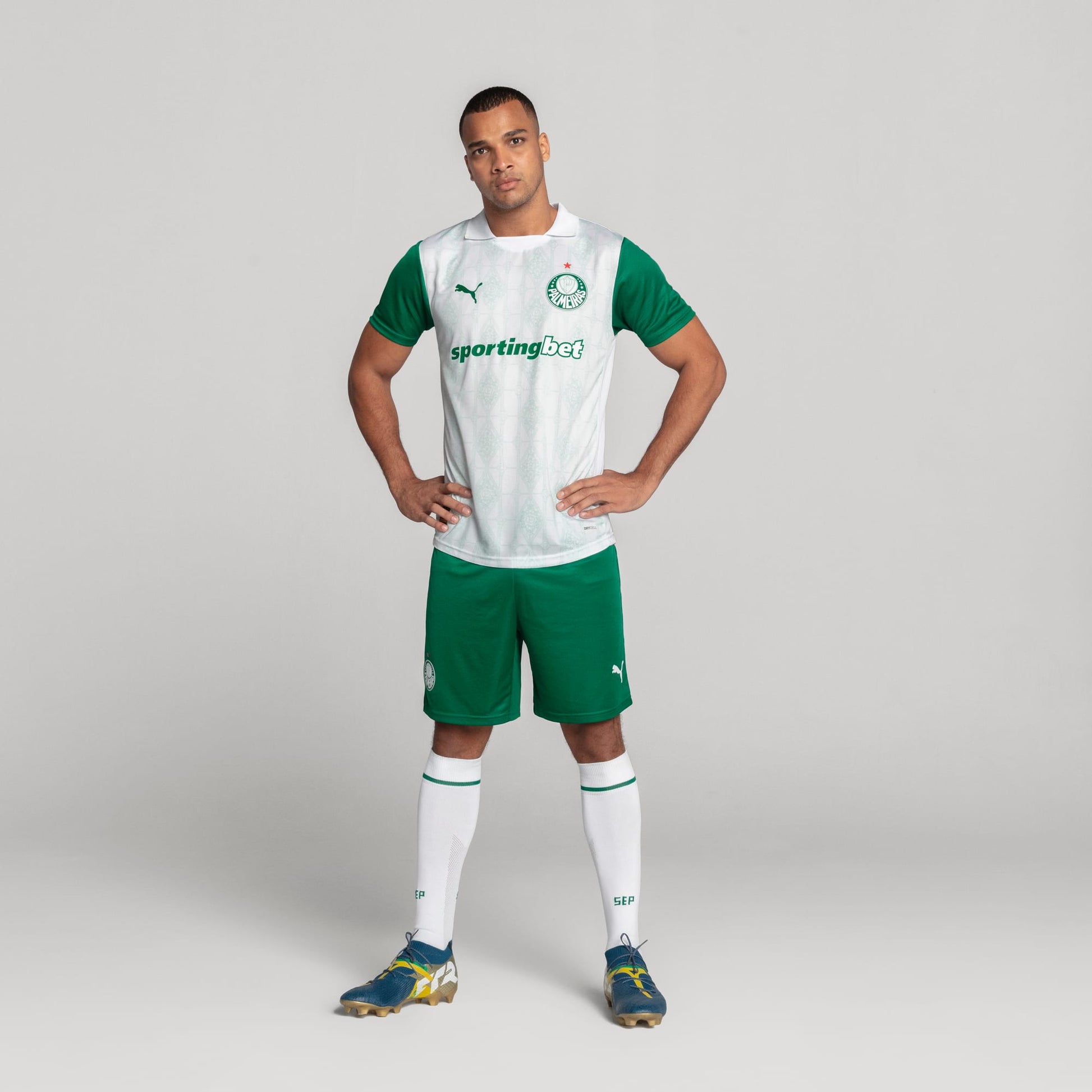 Le maillot extérieur de Palmeiras pour la saison 2025-2026, conçu par Puma, se distingue par une base blanche élégante, complétée par des manches vertes qui rappellent les couleurs traditionnelles du club.