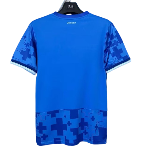 Ce maillot, audacieux et résolument moderne, arbore un magnifique dégradé de bleus, rehaussé par un motif graphique unique de croix stylisées qui lui confère une texture visuelle dynamique et captivante. Le design reflète l'esprit avant-gardiste du club et sa détermination sur le terrain. Les logos de New Balance, du Bayer Leverkusen et du sponsor "Barmenia Gothaer" sont apposés avec élégance, garantissant l'authenticité de cette pièce unique.