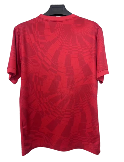 Couleur et motif : Le maillot est d'un rouge écarlate intense, une couleur forte qui n'est pas traditionnellement associée au club, mais qui symbolise la ferveur et l'énergie sur le terrain. Un motif graphique ton sur ton très subtil, inspiré des flammes, parcourt le tissu pour donner une sensation de mouvement et de puissance.