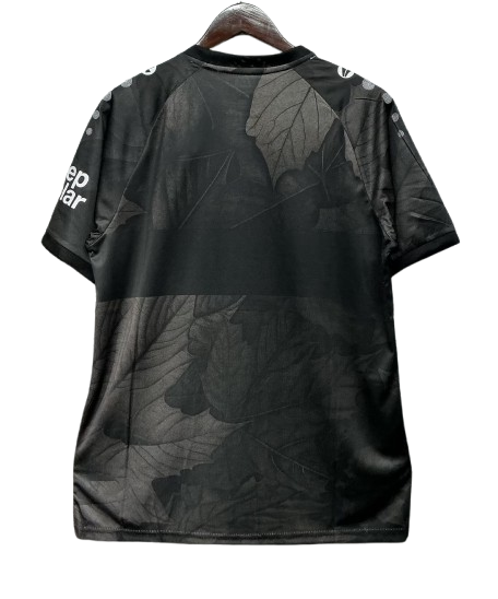 Détails de contraste : Les logos de JAKO, le blason du club et les sponsors sont en blanc éclatant, créant un contraste net et moderne avec le fond noir. Le col épuré et les finitions soignées apportent une touche de sophistication supplémentaire.