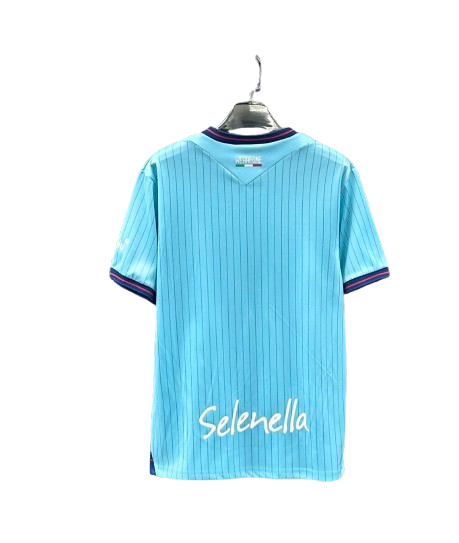 Arborant un bleu turquoise vibrant et orné de fines rayures verticales contrastantes, ce maillot se démarque également par un motif graphique abstrait qui ajoute une touche contemporaine unique. Il est parfait pour ceux qui aiment l'innovation tout en restant fidèles à l'esprit du club. Fabriqué avec des matériaux techniques de pointe, il garantit un confort et une respirabilité exceptionnels, sur le terrain comme en dehors.