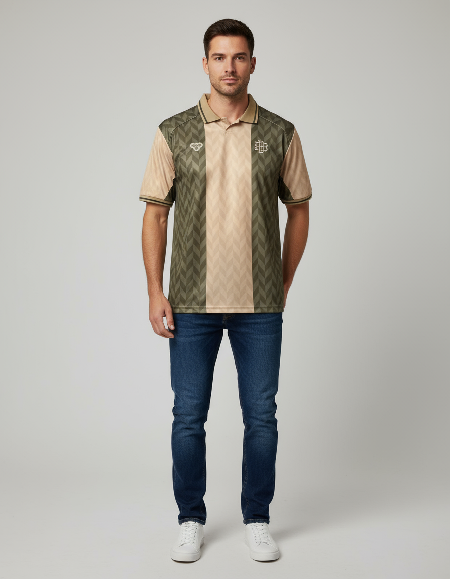 Ce maillot Hummel unique en son genre se distingue par son design moderne et audacieux. Arborant un motif chevron saisissant dans des tons de vert olive profond et de beige rosé subtil, il allie parfaitement style et fonctionnalité. Le col polo classique et les liserés aux manches ajoutent une touche de sophistication, tandis que les logos brodés Hummel et du club (un B superposé) témoignent de l'authenticité et de la qualité.