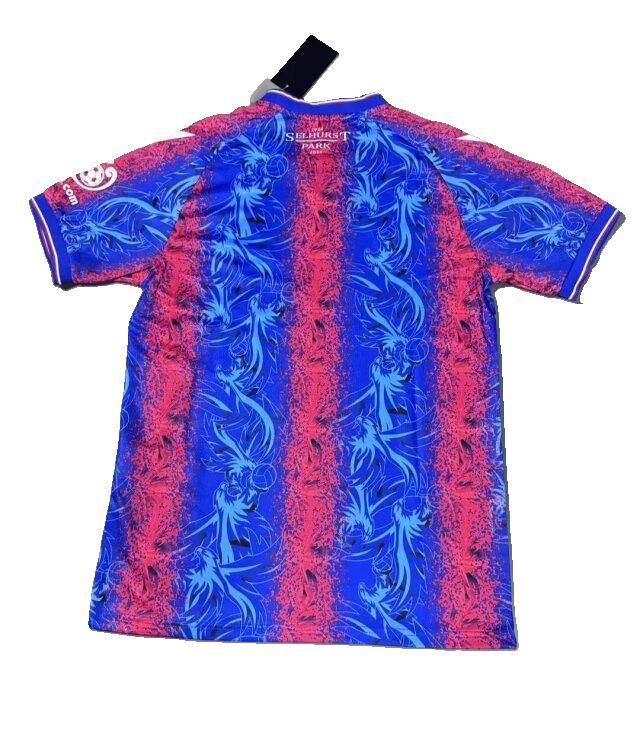 Les bandes verticales rouges et bleues sont réalisées avec un effet « spray », donnant un aspect dynamique et presque artistique au maillot. Ce design intègre également un motif répété de l’aigle, symbole du club, à l’intérieur des bandes, pour renforcer l’identité visuelle de Crystal Palace.