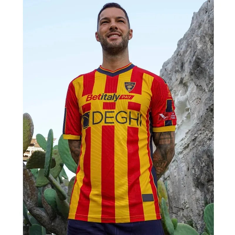 Le maillot domicile de Lecce pour la saison 2024-2025 présente un design classique fidèle à l’identité du club. Il arbore des rayures verticales rouges et jaunes, signature historique de Lecce, accompagnées de bordures bleu foncé sur le col et les manches pour une touche d’élégance supplémentaire.