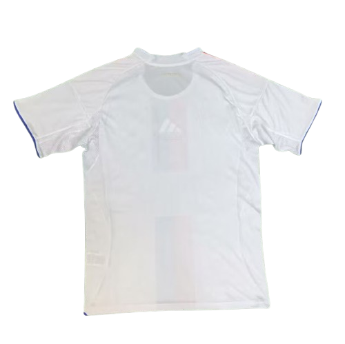 Affichez la fierté lyonnaise avec le maillot domicile Olympique Lyonnais 2025-2026, une création Adidas qui rend hommage à l’histoire de la ville : dominé par le blanc traditionnel, il se distingue par une bande verticale rouge et bleue centrale, emblématique du club, et un motif ton sur ton inspiré d’une mosaïque gallo-romaine sur la poitrine.