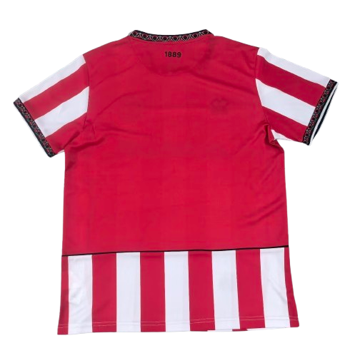 Couleur et motif : Le maillot est un retour aux sources, arborant les rayures verticales rouges et blanches emblématiques qui font la fierté des supporters. Un motif graphique subtil, qui imite le tranchant d'une lame, est tissé dans les rayures, un clin d'œil direct au surnom du club.