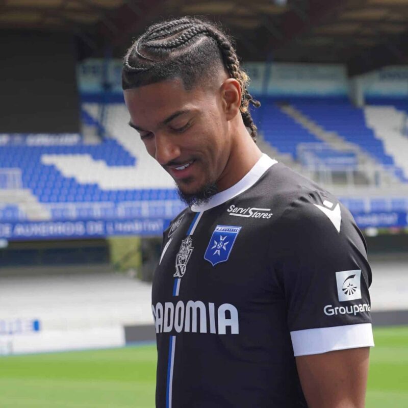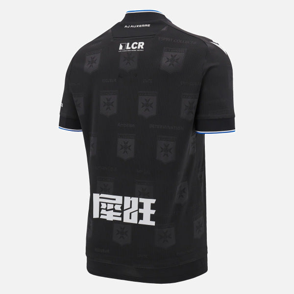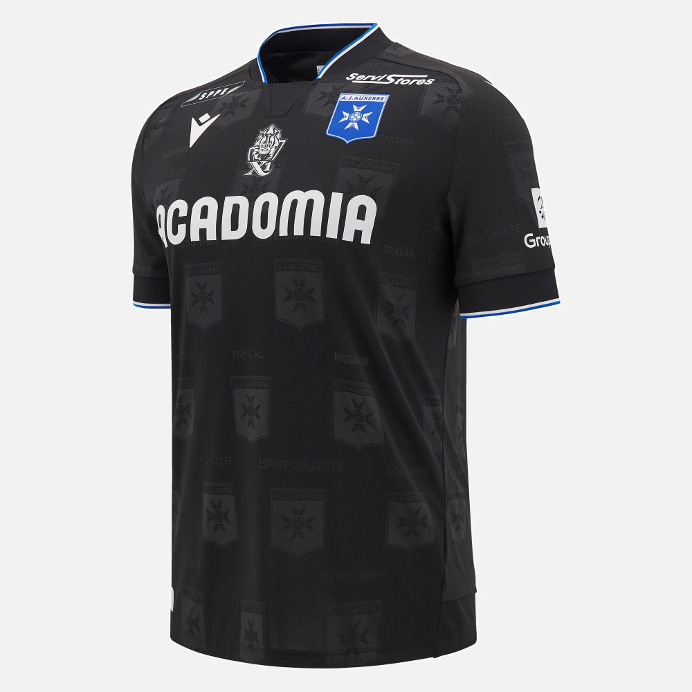 Le maillot extérieur de l’AJ Auxerre pour la saison 2024-2025, conçu par Macron, se distingue par une dominante noire élégante, associée à un col Mao et de fines bordures blanches pour une touche de contraste raffinée.