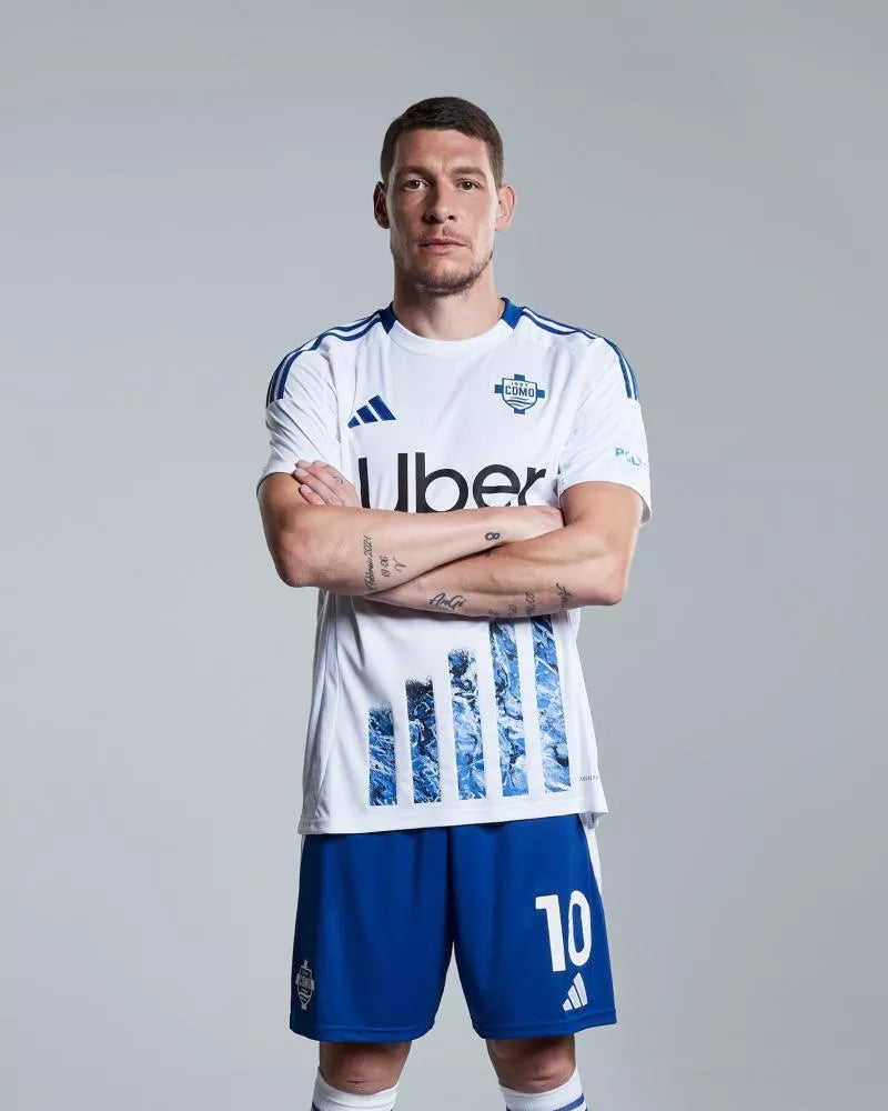 Le maillot extérieur du Como 1907 pour la saison 2024-2025, conçu par Adidas, est principalement blanc avec des touches de bleu. Ce design épuré reprend les couleurs traditionnelles du club pour les matchs à l’extérieur, avec le logo Adidas et le sponsor Uber visibles sur la poitrine. Le maillot allie sobriété et élégance, tout en assurant confort et performance grâce à la qualité des matériaux utilisés.