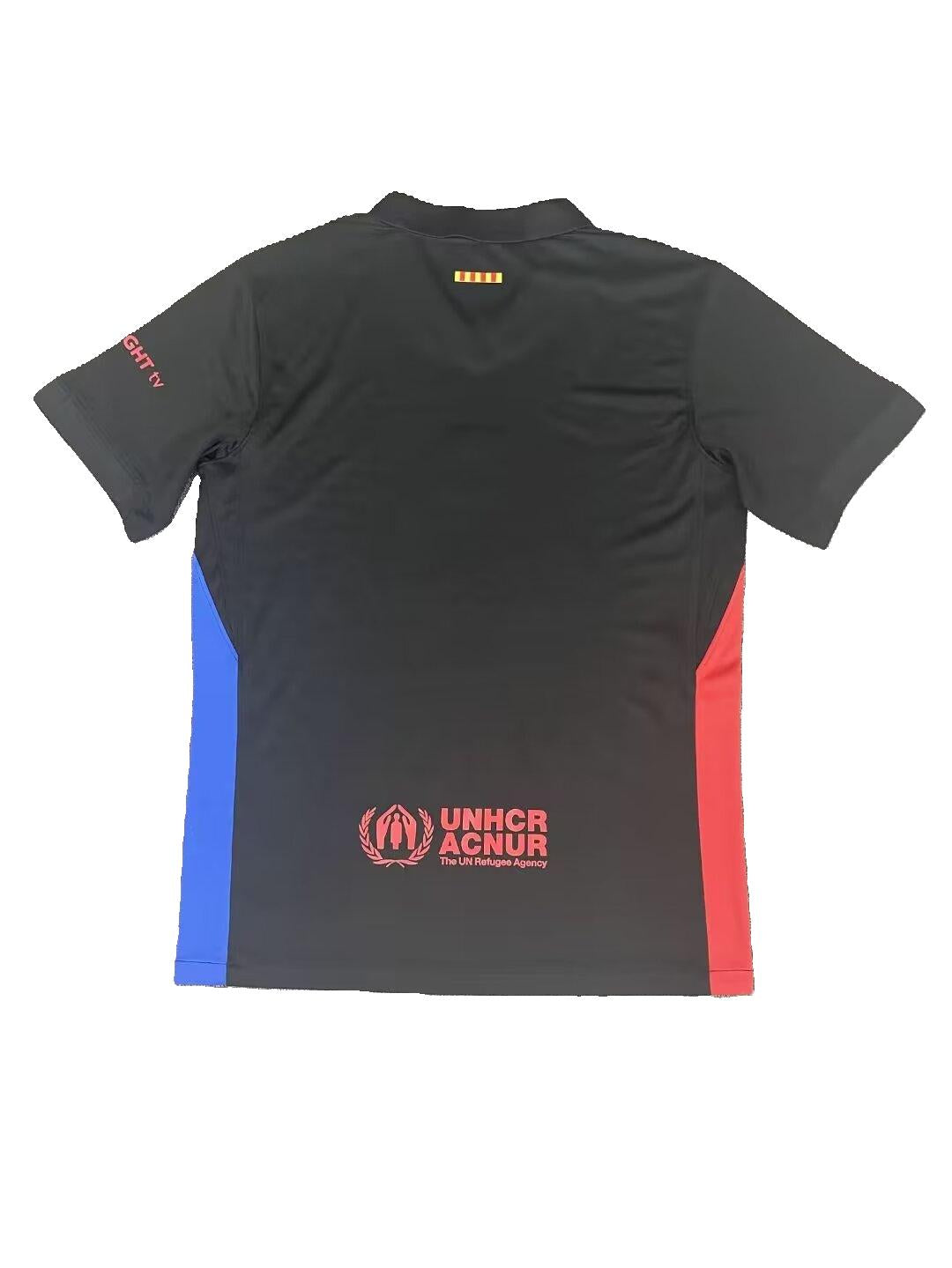 Ce maillot se démarque par son minimalisme et son élégance, tout en incorporant subtilement l’ADN du Barça via les bandes latérales rouge et bleue.