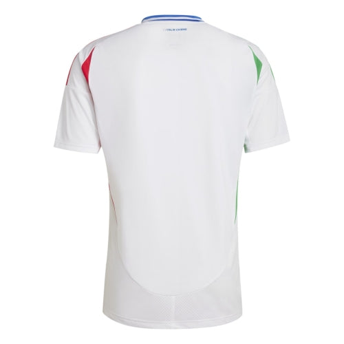 Le maillot extérieur de l’Italie 2024-2025, conçu par adidas, se distingue par une base blanche rehaussée de touches tricolores (vert, blanc, rouge) inspirées du drapeau italien, qui occupent une place centrale dans le design.