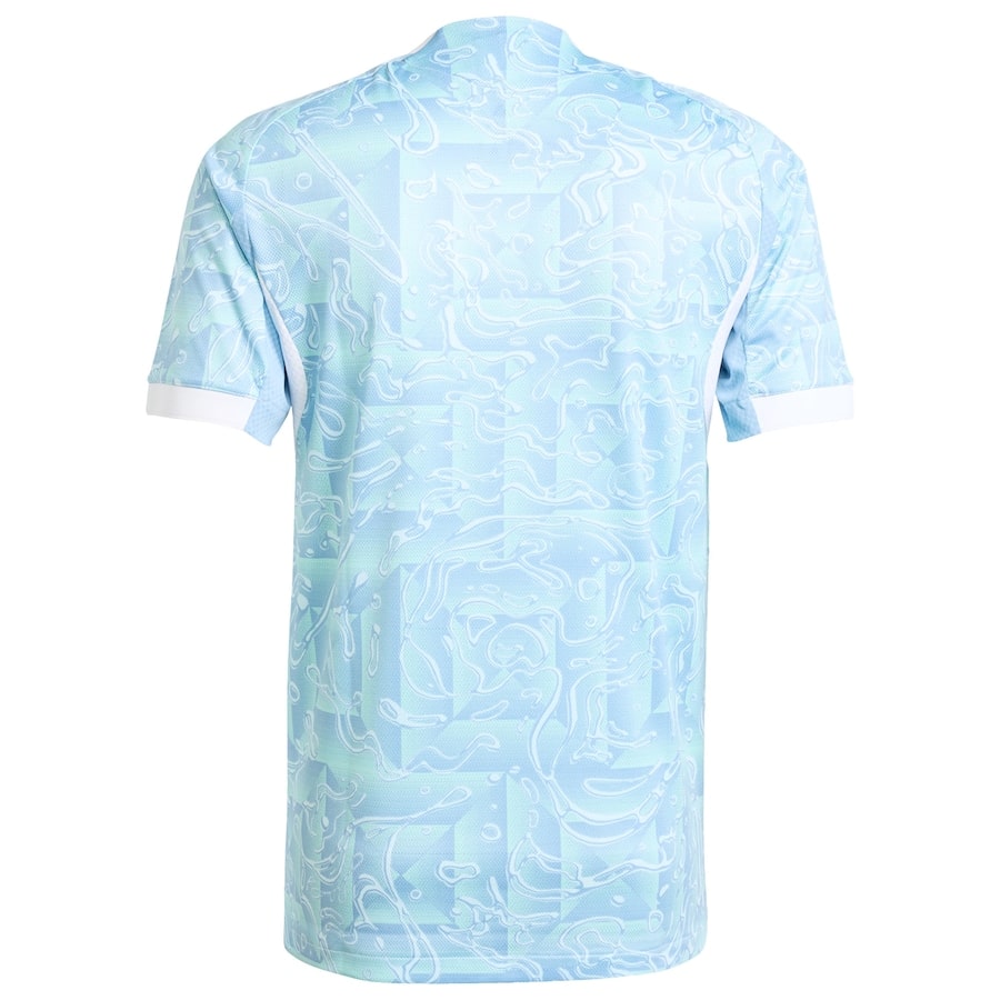 Ce modèle se distingue par une base bleu clair élégante, rehaussée de logos blancs et de détails jaune citron pour une touche de fraîcheur et de modernité. Le design unique combine un motif à gouttes d’eau et des blocs carrés en 3D, offrant un rendu dynamique et innovant qui ne passera pas inaperçu sur et en dehors du terrain.
