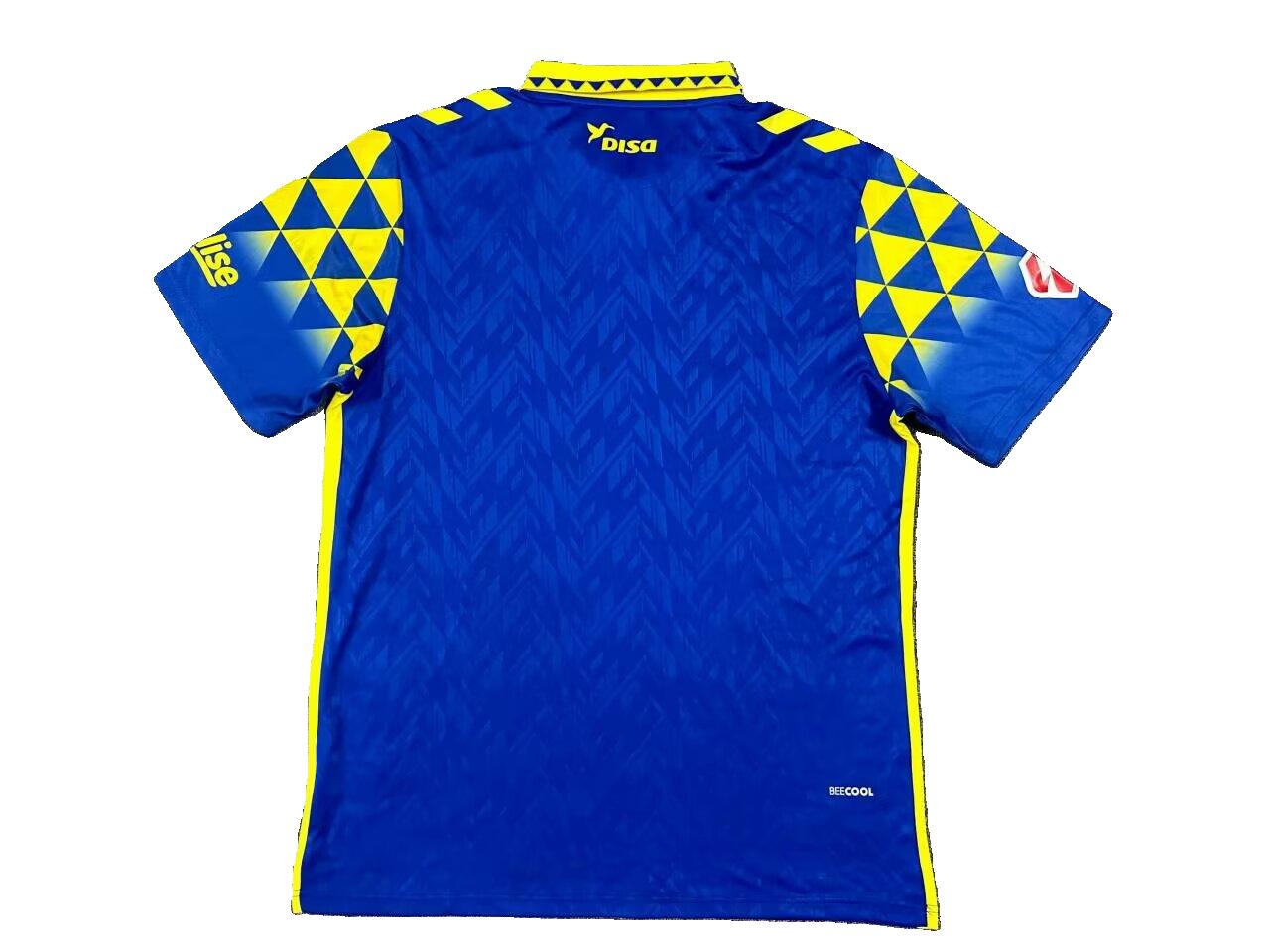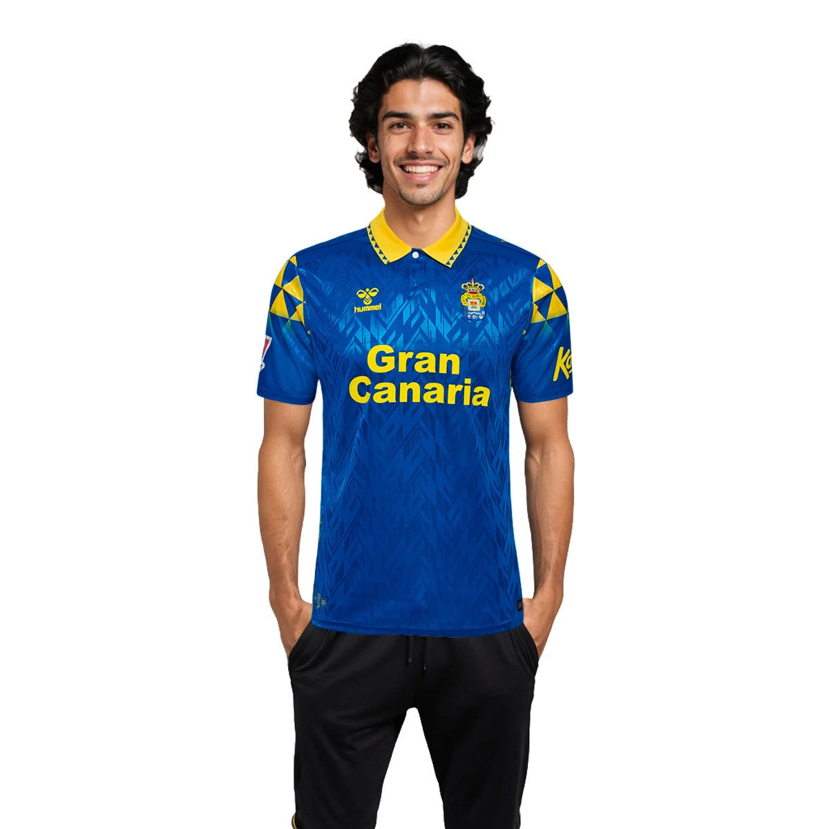 - Le maillot extérieur 2024-2025 de l’UD Las Palmas, conçu par Hummel, se distingue par une couleur principale bleu foncé, contrastée par des détails jaunes, en particulier pour les logos et les finitions.