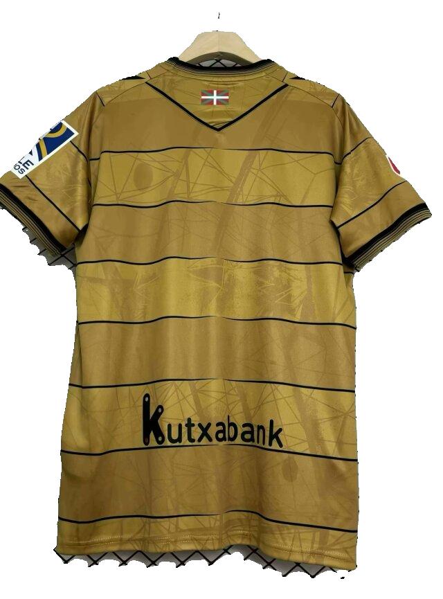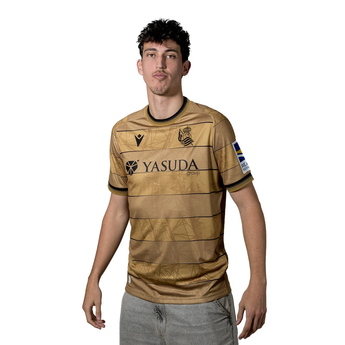Le maillot extérieur de la Real Sociedad pour la saison 2024-2025, conçu par Macron, se distingue par une couleur dominante dorée. Il présente un motif rustique et pulvérisé, inspiré par la structure interne du stade Anoeta, symbolisant l’attachement du club à son histoire et à son identité. Ce maillot est fabriqué en polyester 100 % recyclé (Eco Micromesh), garantissant à la fois respirabilité, confort et engagement écologique. Les détails comprennent l’impression sublimée, le patch Macron Hero en silicone, et une finition soignée, faisant de ce maillot une pièce à la fois innovante et respectueuse de l’environnement.