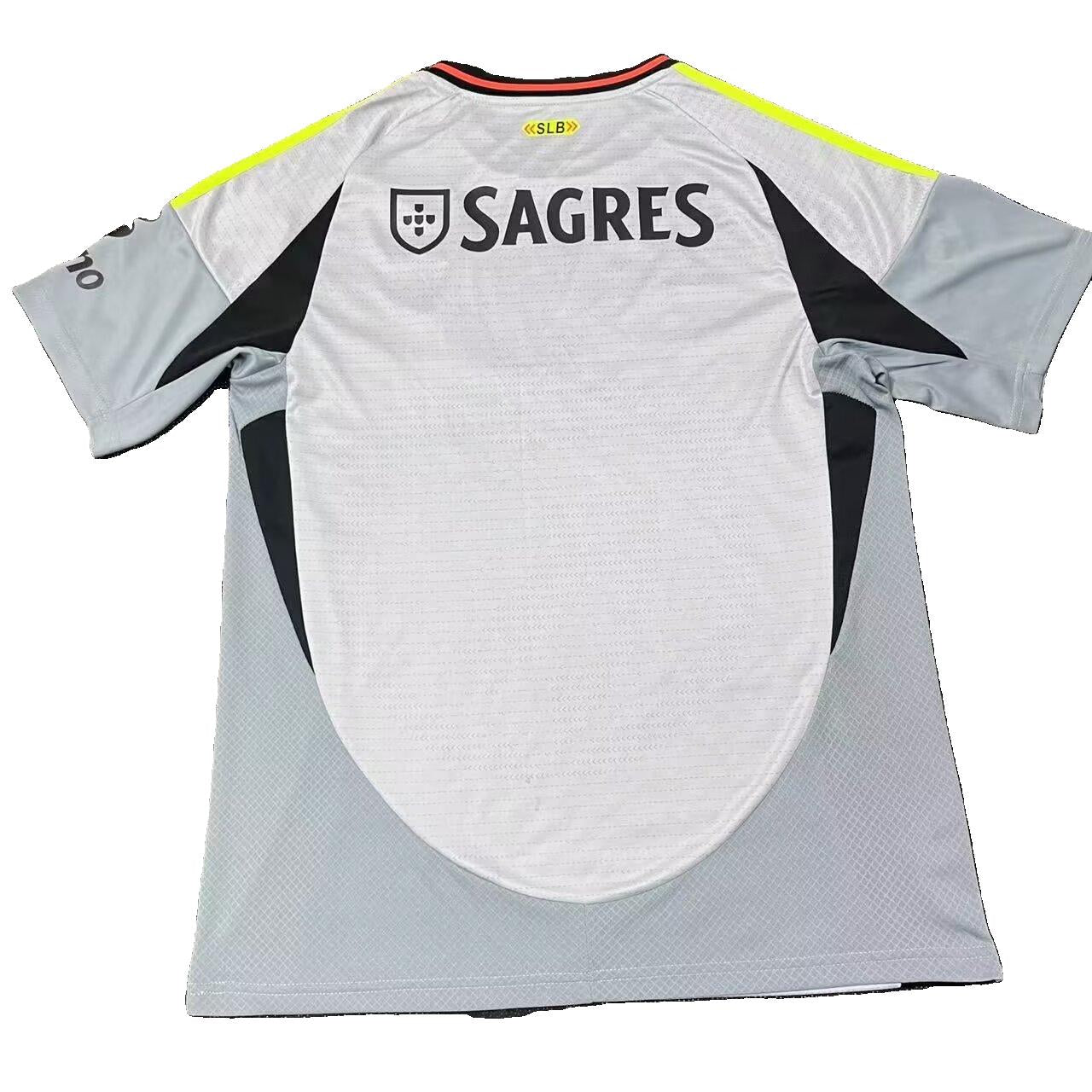 Le maillot third du Benfica Lisbonne pour la saison 2024-2025, conçu par adidas, présente une base gris et noir rehaussée de détails jaunes solaires, notamment sur les trois bandes adidas aux épaules et sur le logo du club, qui apparaît dans une teinte fluorescente pour une visibilité accrue.