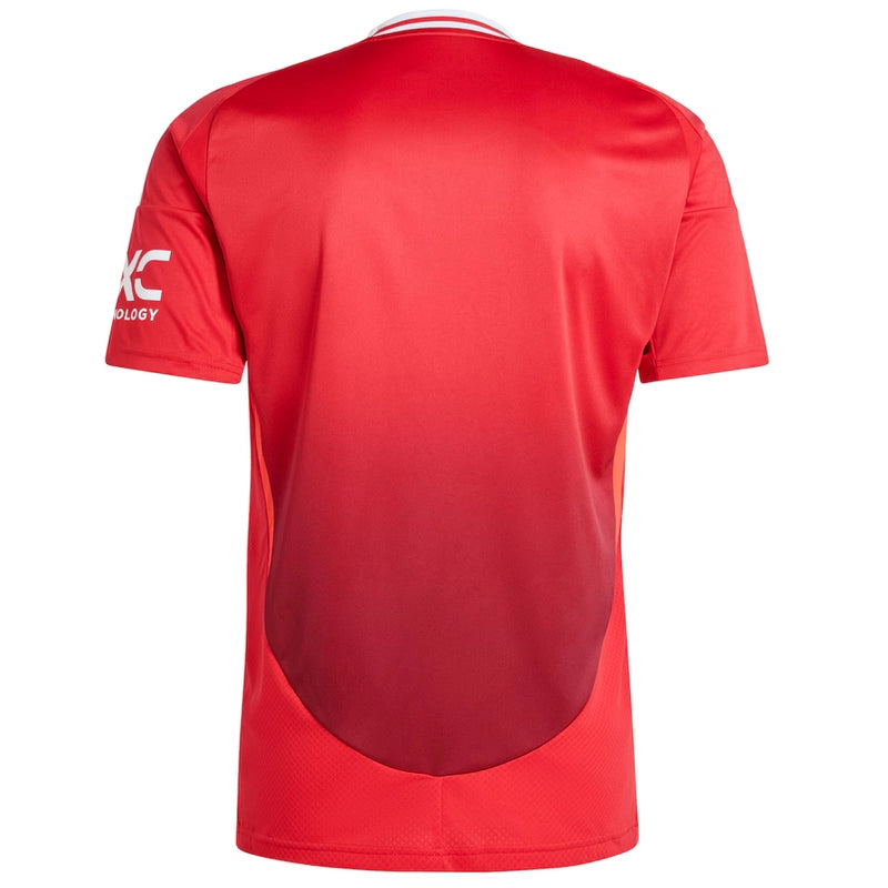 Le maillot domicile Manchester United 2024-2025, conçu par adidas, reste fidèle à la tradition avec une base rouge emblématique du club.