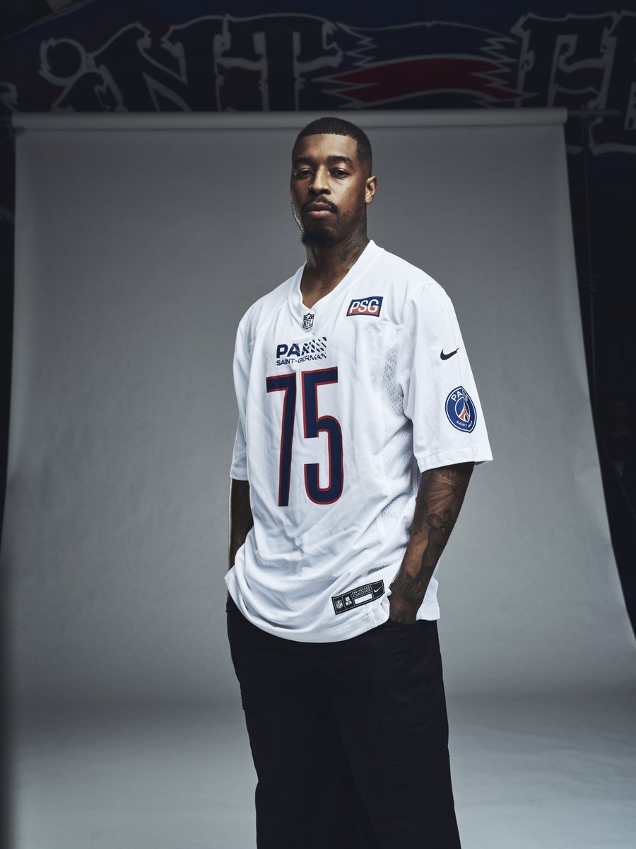 Design exclusif : Couleur blanche élégante, grand numéro 75 (clin d’œil au département de Paris), logos officiels NFL et PSG, et inscription « PARIS SAINT-GERMAIN » stylisée sur la poitrine.