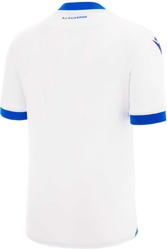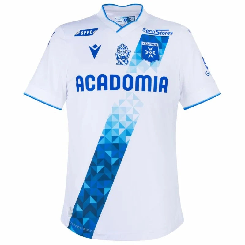 Le maillot domicile de l’AJ Auxerre pour la saison 2024-2025, conçu par Macron, se distingue par sa dominante blanche, fidèle à l’identité historique du club. Il présente un col en V et des manches ornées de fines rayures bleues, apportant une touche élégante et classique. La grande nouveauté de cette saison est la présence d’une bande diagonale composée de triangles aux différentes nuances de bleu, qui modernise l’ensemble et symbolise le renouveau du club.