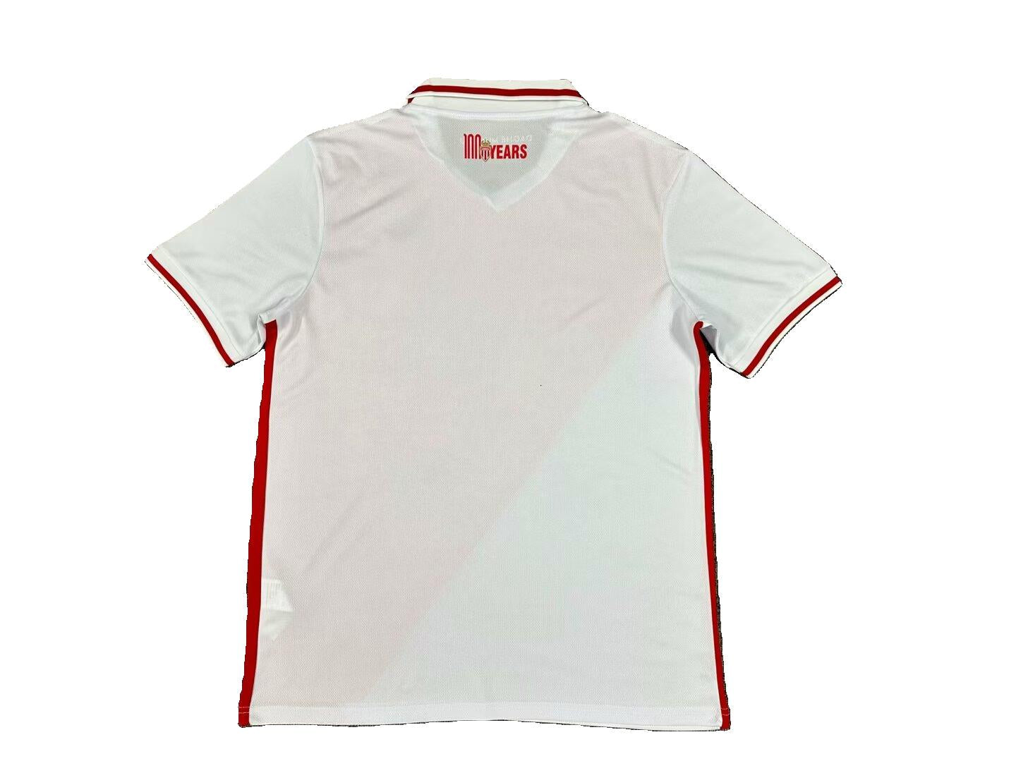 Le maillot domicile de l’AS Monaco pour la saison 2024-2025, conçu par Kappa, célèbre le centenaire du club en rendant hommage à ses huit titres de champion de France. Il reprend la mythique diagonale rouge et blanche imaginée par la Princesse Grace, signature visuelle du club, et y intègre des détails inspirés de chacune des saisons victorieuses : manches blanches avec détails rouges, bande verticale rouge sur le flanc droit, cercle subtil autour de l’écusson, col en V blanc agrémenté d’une bande rouge, et ombre gris clair sous la diagonale sur la face avant.