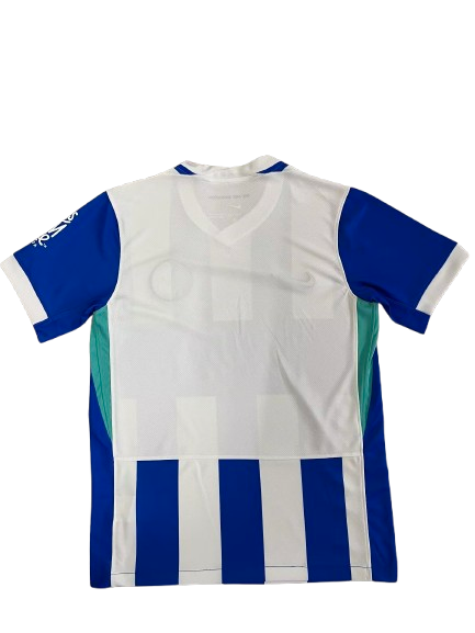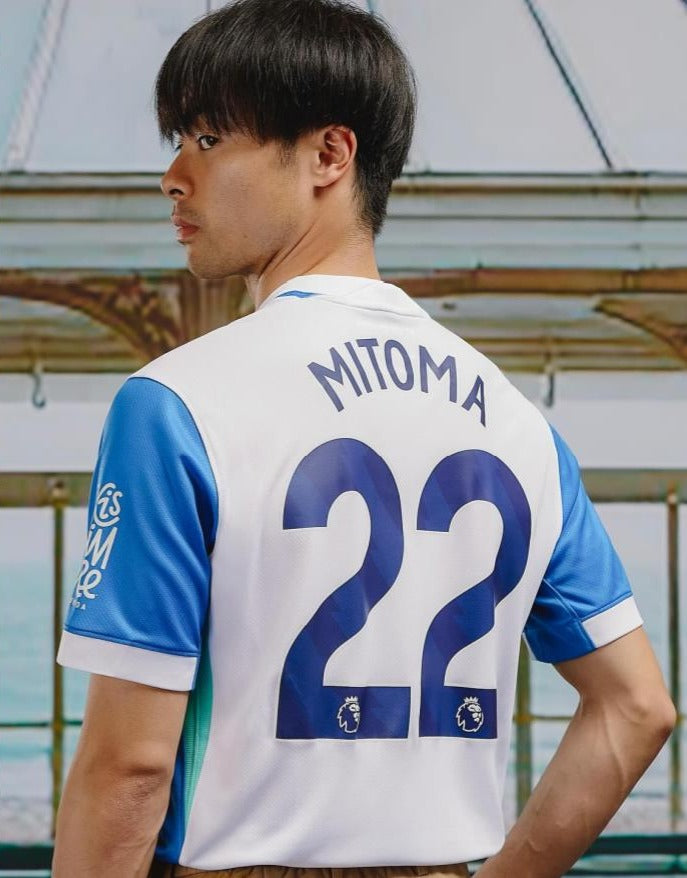 À l’intérieur du col, l’inscription « WE ARE BRIGHTON » affirme fièrement l’appartenance au club. Le maillot est complété par un short et des chaussettes bleus pour une silhouette dynamique et facilement reconnaissable sur le terrain comme en tribune.
