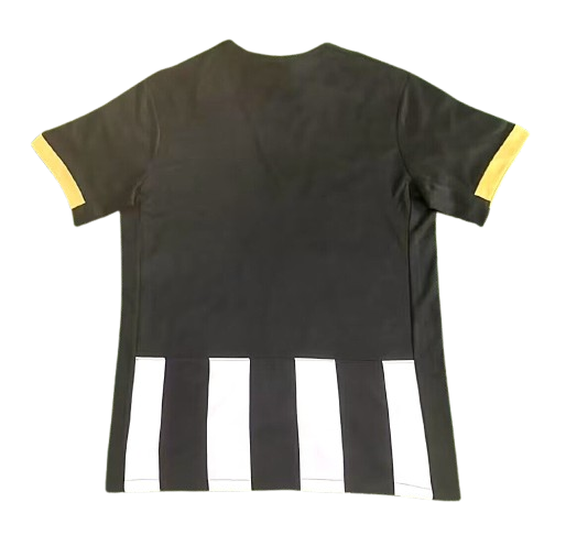 Couleur et motif : Le maillot est un retour aux sources, arborant les rayures verticales noires et blanches emblématiques qui font la fierté des supporters. Un motif graphique subtil et diagonal parcourt le tissu noir, ajoutant une touche de modernité au design intemporel.