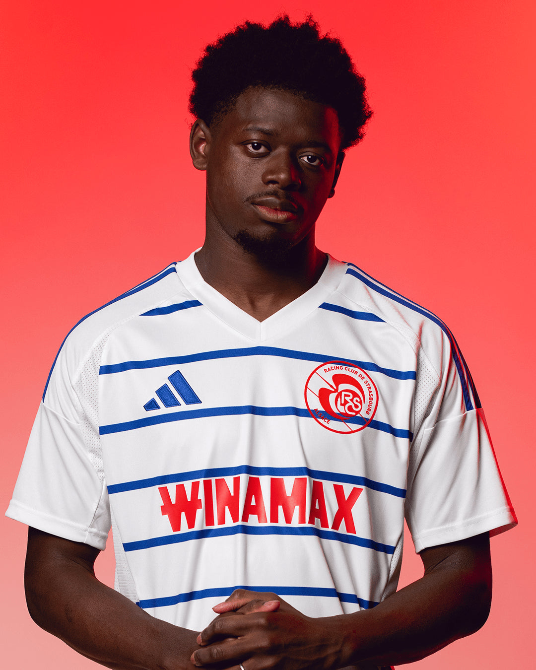 Le maillot extérieur du RC Strasbourg pour la saison 2024-2025, conçu par adidas, se distingue par une base blanche élégante rehaussée de fines rayures horizontales bleues, offrant un style à la fois moderne et rétro.