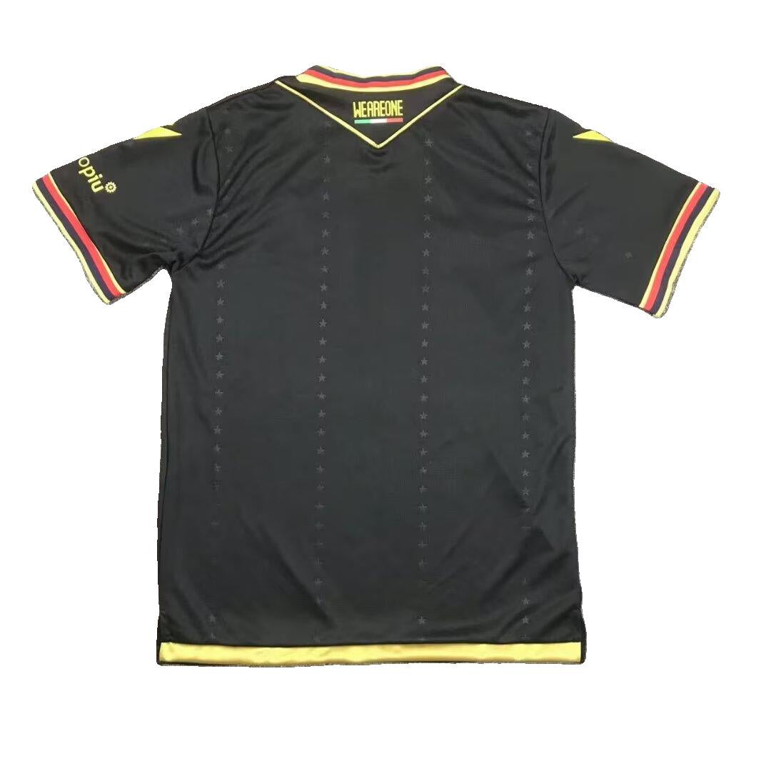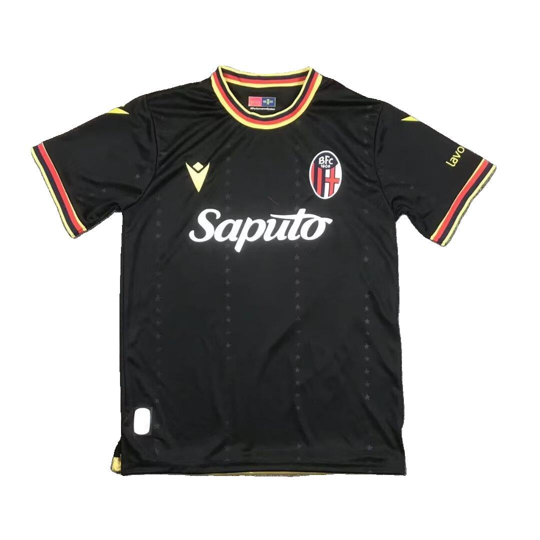 Le maillot third noir du Bologne FC pour la saison 2024-2025 est une édition spéciale appelée "European Kit", conçue par Macron. Ce maillot est entièrement noir, enrichi de détails dorés et de touches rouge et bleu au niveau du col rond et des manches, entourées de deux lignes dorées. Le design est orné à l’avant et à l’arrière de rangées de petites étoiles en relief, évoquant les soirées européennes et la participation du club à la Ligue des Champions. Ce modèle célèbre le retour de Bologne sur la scène européenne et se distingue nettement du troisième maillot traditionnel bleu et rouge porté en Serie A.