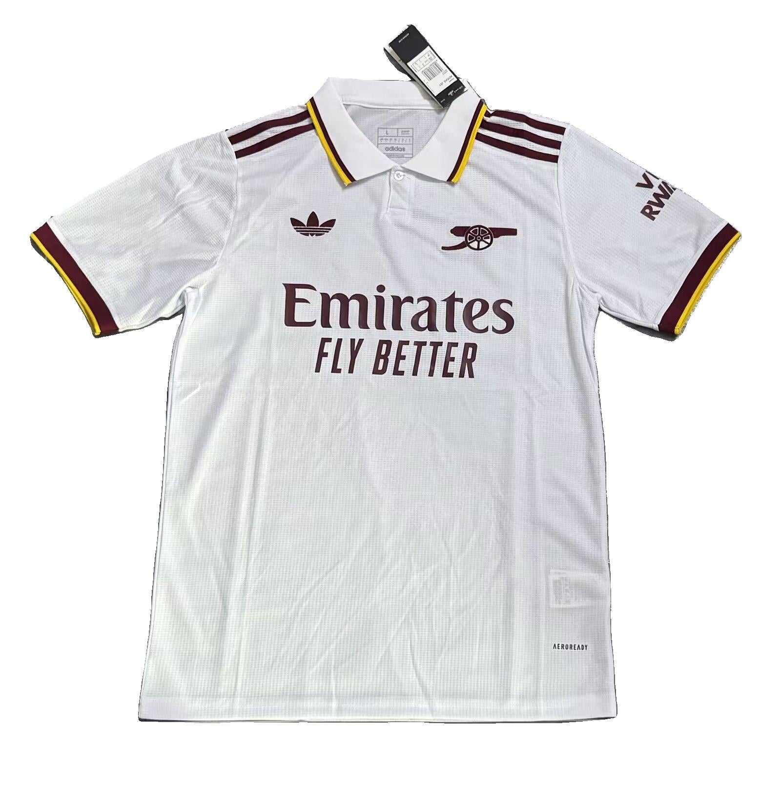 Les logos bordeaux et les finitions dorées rappellent les grandes heures du club et font de ce maillot l’un des plus élégants jamais conçus pour Arsenal.