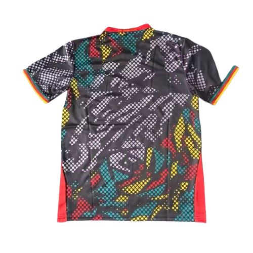Design "Black Mode" : Une base noire intense qui fait ressortir les motifs graphiques en pointillés aux couleurs du drapeau (vert, rouge, jaune), créant un contraste saisissant et moderne.