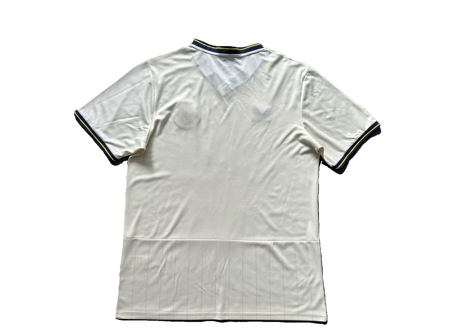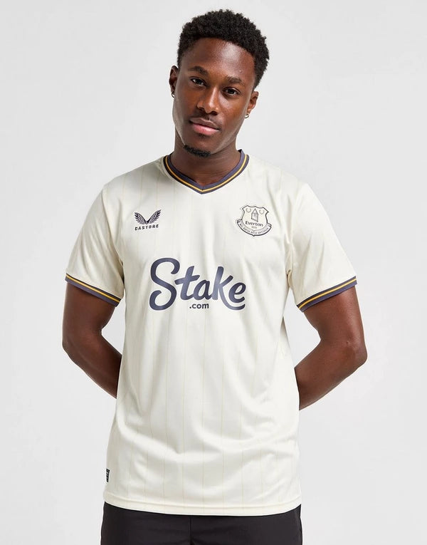 - Le troisième maillot d’Everton FC pour la saison 2024-2025, conçu par Castore, se distingue par une couleur principale blanc cassé (off white), agrémentée de fines rayures ton sur ton qui apportent une touche élégante et subtile.