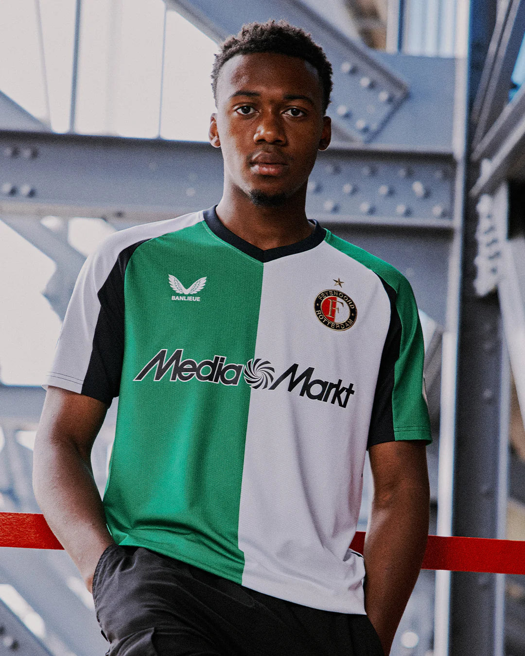 Le maillot third du Feyenoord pour la saison 2024-2025, conçu par Castore en collaboration avec la marque lifestyle rotterdamoise Banlieue, s’inspire directement du célèbre maillot extérieur vert et blanc porté lors de la saison 2003-2004, élu « plus beau maillot extérieur » du club par les supporters en 2020.