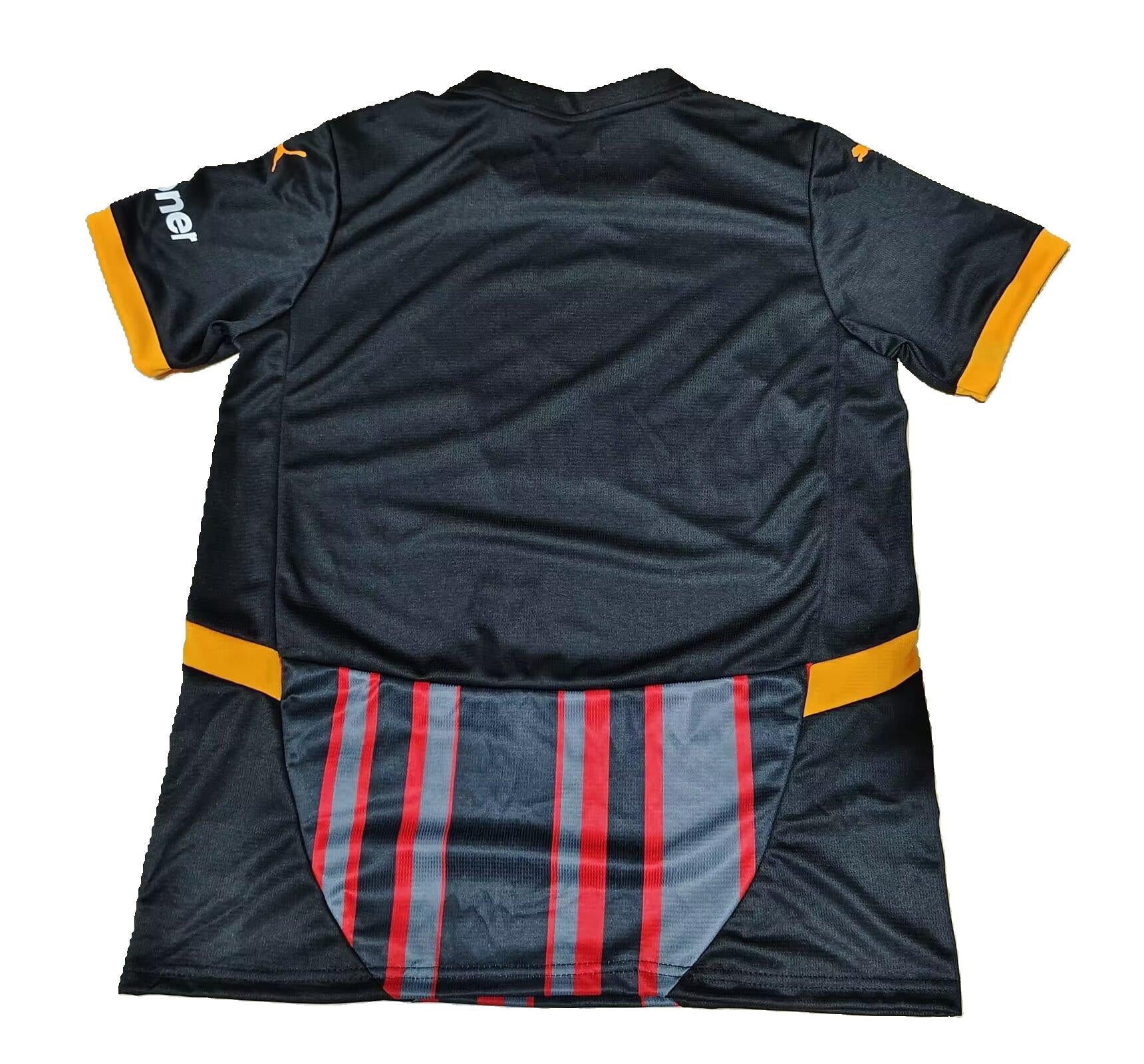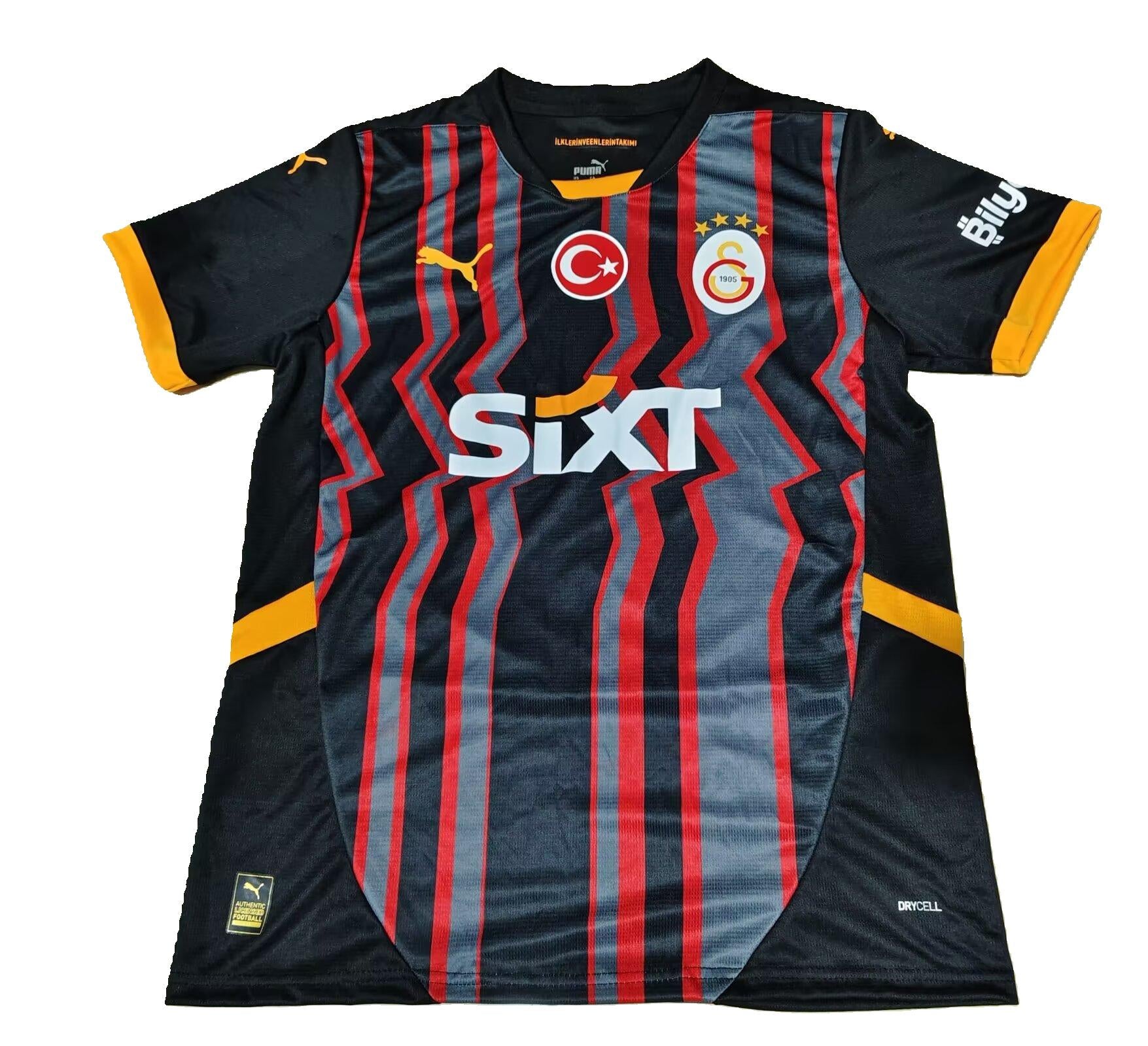 Le maillot third du Galatasaray pour la saison 2024-2025, conçu par Puma, présente une base noire élégante rehaussée de détails orange intense, notamment sur les logos et les éléments graphiques.