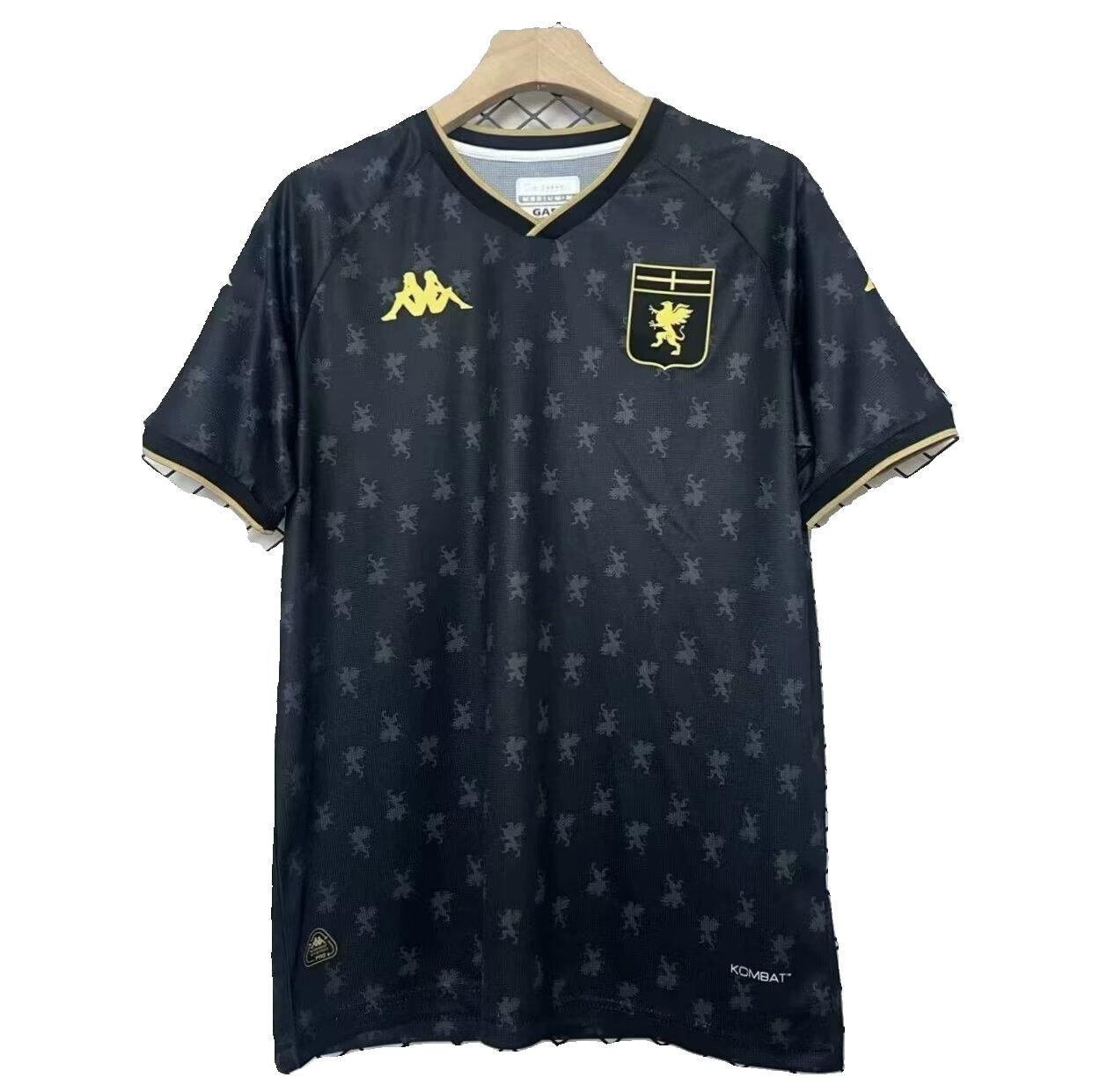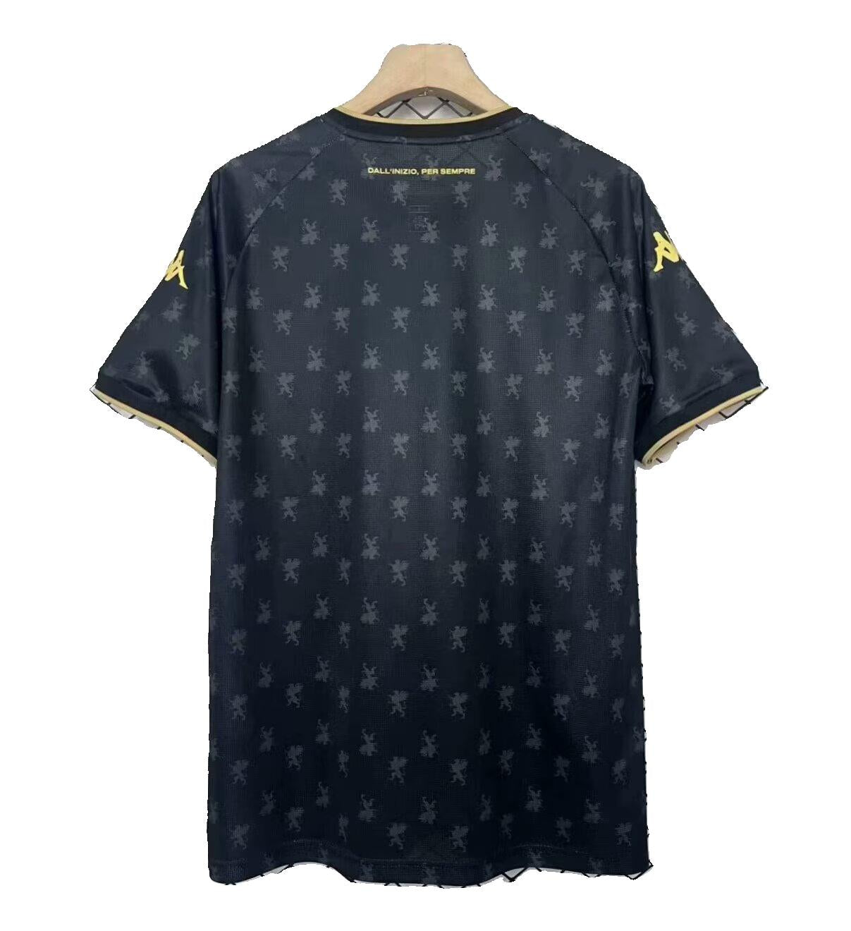 Le troisième maillot (third) du Genoa CFC pour la saison 2024-2025, conçu par Kappa, se distingue par une dominante noire rehaussée d’accents dorés. Le col en V, les poignets, le logo Kappa ainsi que l’écusson du club sont tous dorés, conférant à l’ensemble un aspect luxueux et mystérieux. Ce maillot KOMBAT PRO 2025 est fabriqué en tissu élastique recyclé et bénéficie de la technologie HYDRO-WAY PROTECTION pour un confort optimal. Ce design « Golden Dark Side » incarne l’élégance et la modernité, tout en restant fidèle à l’identité du club.