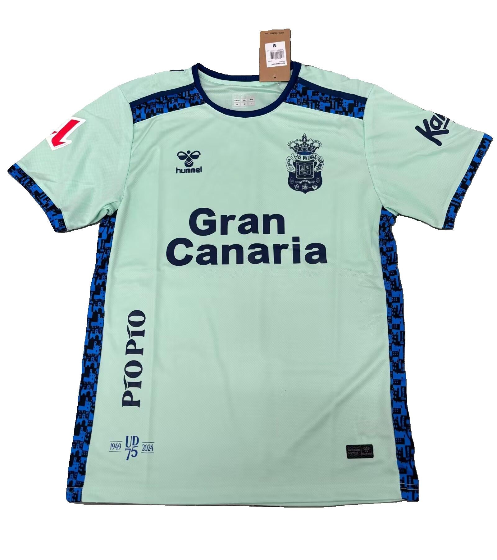 Les logos du club, de Hummel et du sponsor "Gran Canaria" sont bien visibles, généralement en bleu marine pour contraster avec le vert dominant.