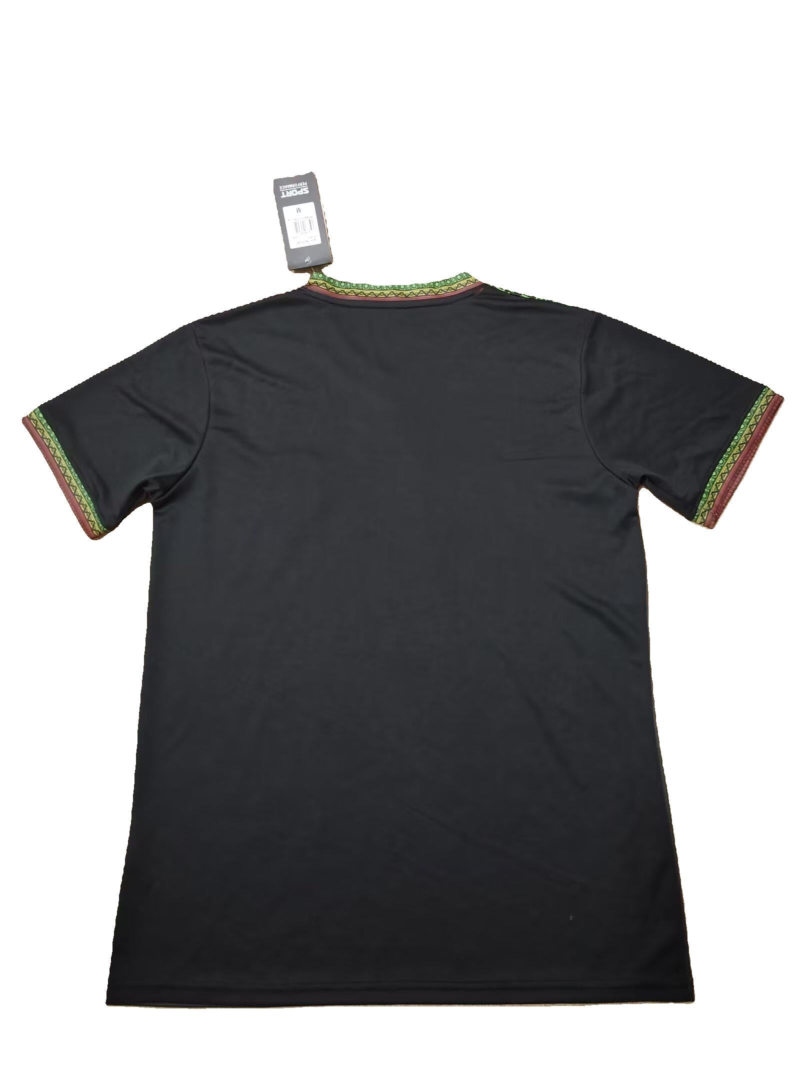 Ce maillot, signé Airness, se distingue par sa base noire raffinée, symbole de puissance et de sobriété, sublimée par des motifs en V rouges et verts inspirés des couleurs du drapeau malien.