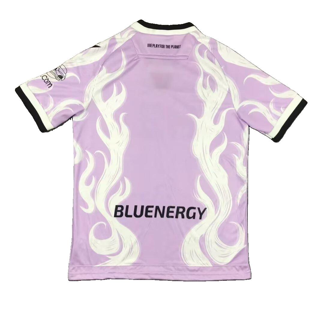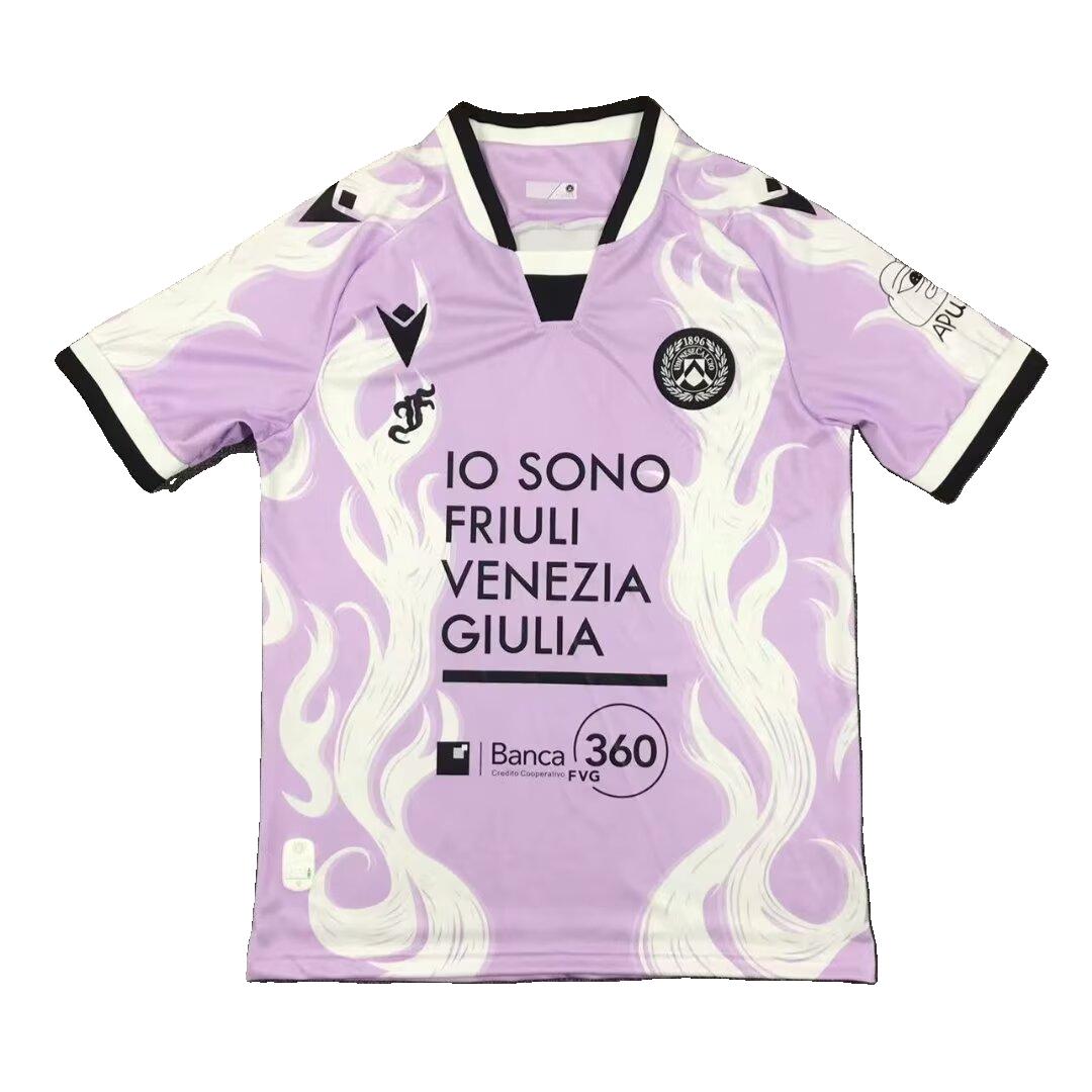 Le maillot third de l’Udinese pour la saison 2024-2025, conçu par Macron, se distingue par une teinte de glycine claire (violet pâle) et un motif graphique sublimé représentant des flammes blanches irrégulières, évoquant les rayons du soleil, un élément symbolique pour la ville d’Udine.